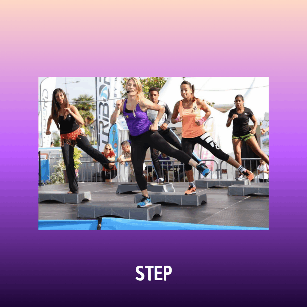 Le Step chorégraphié est un cours cardio qui sollicite les muscles du bas du corps ainsi que la coordination et la mémoire. L’ensemble chorégraphié est appris sur plusieurs séances et est modifié au bout d’un mois et demi.